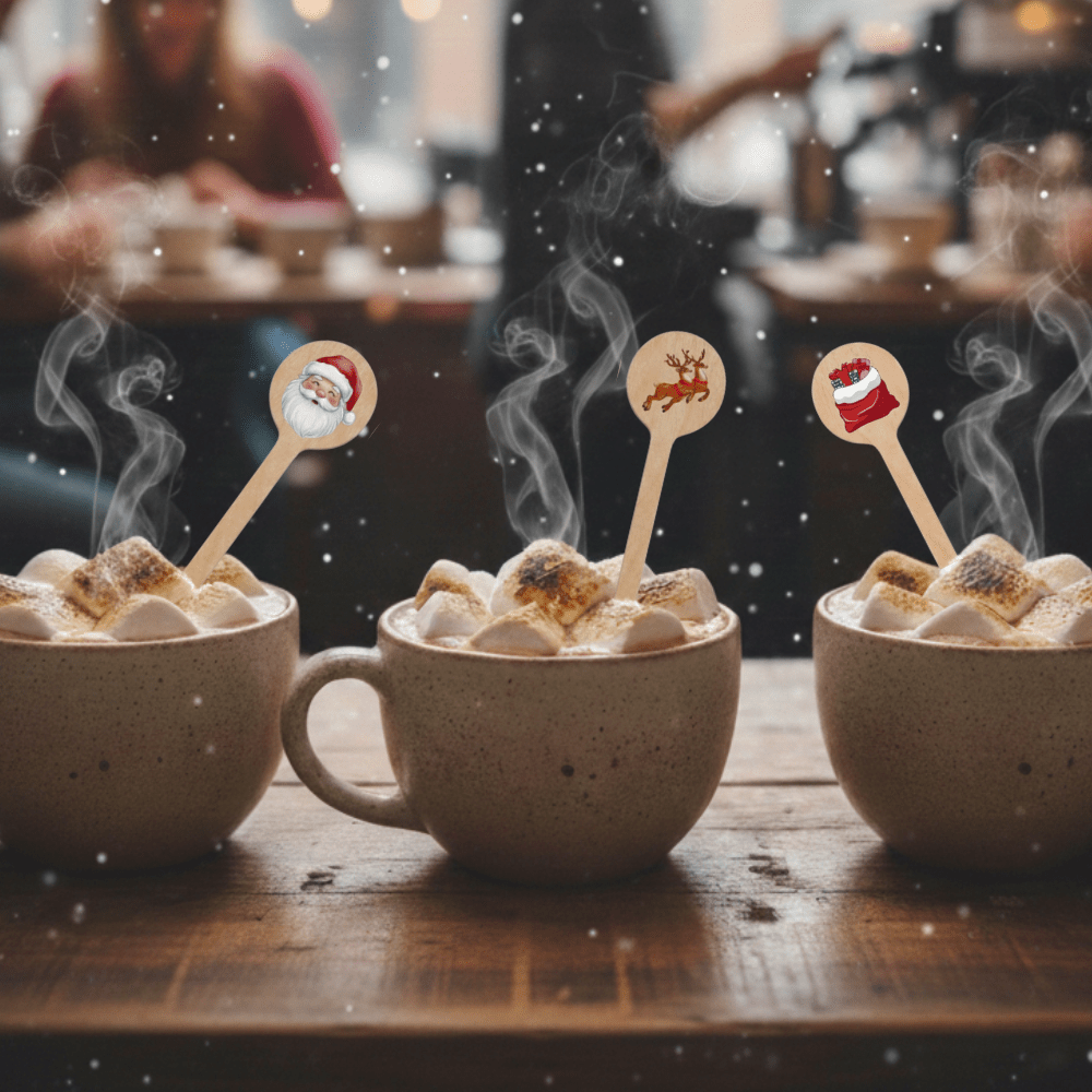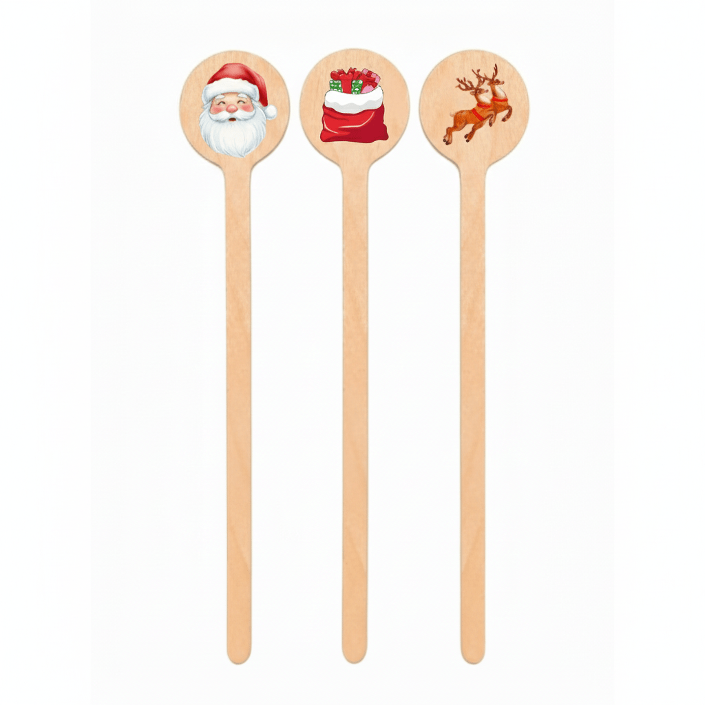 These Holiday Christmas Icons Stirrers feature classic seasonal designs—Santa, festive stockings, and reindeer—printed on smooth, natural wooden for a warm, premium look.